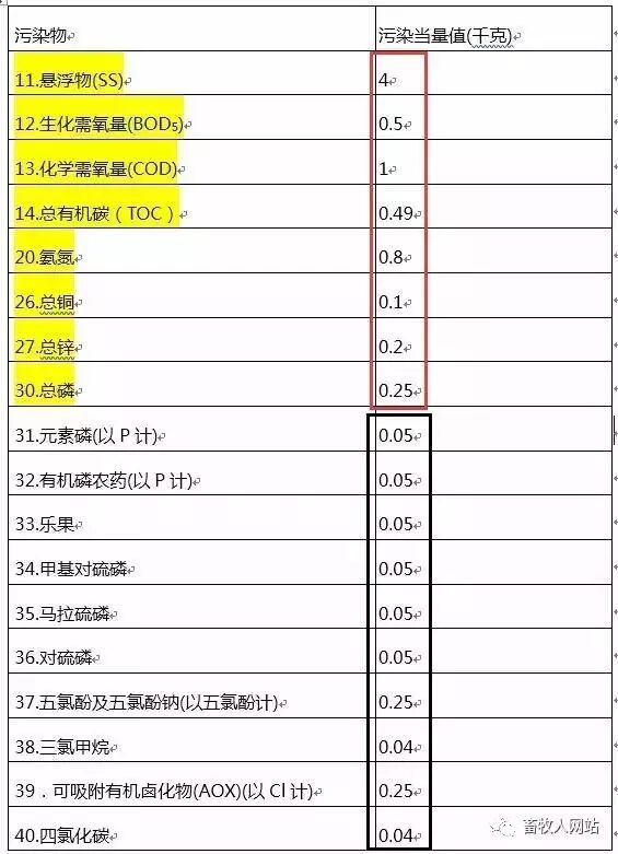 從公布的第二類水污染物污染當量值來看,表2中這些生豬養殖水污染中的關鍵指標污染當量值都是比較高的(如紅框與黑框中對比)。